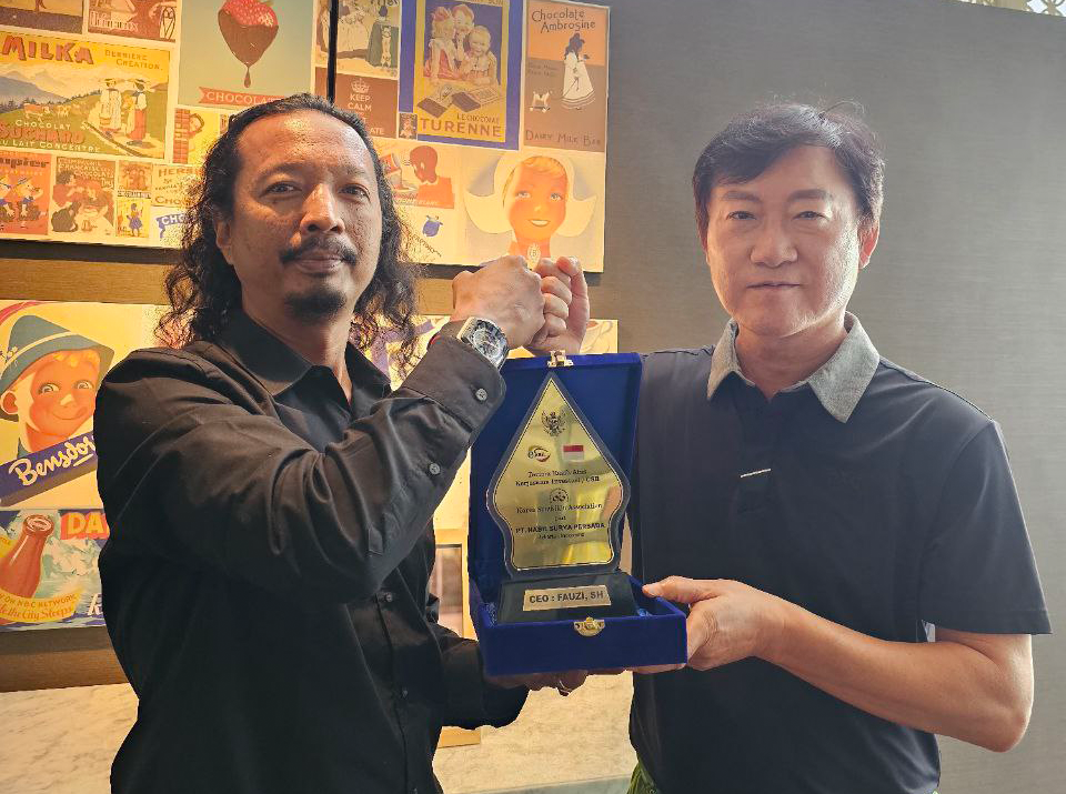 | ▲김종백 중앙회장(사진 오른쪽)이 지난 8월 방문당시 FAUZI PT. NABIL SURYA PERSADA대표에게 상호 협력패를 받고 있다. |