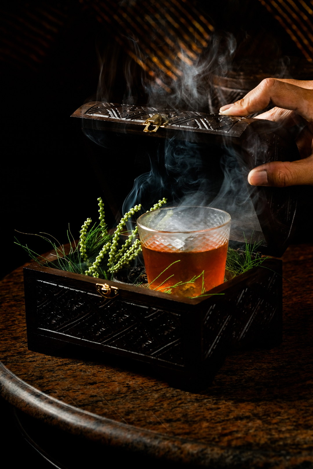 ◆ 청각 & 촉각: 1920년대 분위기의 재즈와 내 손으로 직접 만드는 폐기물 제로 칵테일 아페리티프의 내부는 화이트 톤의 1920년대 고풍스러운 아르데코 디자인로 꾸며져 들어서자마자 영화 <위대한 개츠비>의 한 장면 속에 있는 듯한 분위기를 자아낸다. 레스토랑과 연결된 핀스트라이프(Pinstripe) 바는 스피크이지바 컨셉으로 금주법 시대에 오히려 전 세계적으로 대중화되었던 칵테일 문화와 패션을 상징하는 이름으로 발리 출신 헤드 믹솔로지스트 판지 위스라완(Panji Wisrawan)이 1920년대와 30년대의 인물에서 영감을 받아 현지 재료를 결합한 시그니처 칵테일 메뉴를 선보인다. 화려한 샹들리에, 체스터필드 가죽소파 등 멋진 신사 클럽을 연상시키는 바 공간에서는 매주 목요일엔 재즈 공연, 금요일엔 발리 로컬 아티스트의 공연이 라이브로 펼쳐져 칵테일과 함께 맛있게 청각을 채운다.
