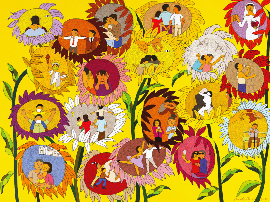 ‘밝음에 관하여’ 展에 선보이는 작품들은 황주리 작가의 탯줄과도 같은 ‘식물학’ ‘삶은 어딘가 다른 곳에’ 시리즈다. 해바라기·백합·선인장이 꽃송이가 얽히고설켜 끝없이 뻗어 나가는 ‘식물학’ 연작은 인생의 기쁨과 슬픔, 삶과 죽음, 일상과 이벤트가 날실과 씨실처럼 직조된 우리 삶을 상징한다. 아픔이 있으면 치유와 기쁨이 따라온다는 의미의 ‘식물학’ 시리즈는 바라보는 것만으로도 온몸으로 밝은 기운을 받는 느낌이다.