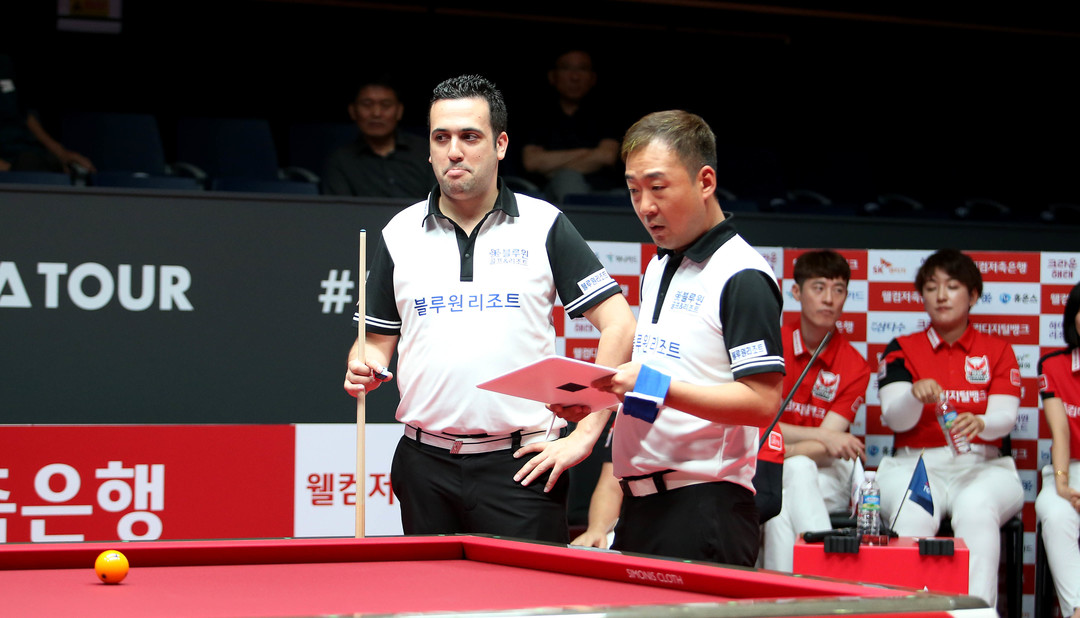 경기 초반부터 블루원의 분위기가 좋았다. 다비드 사파타(스페인)와 엄상필이 분위기를 잡았다. 사파타가 하이런 9점을 몰아친 가운데, 비롤 위마즈(튀르키예)와 이상대를 3이닝만에 11:0으로 돌려세웠다. 2세트에선 웰컴이 바로 반격했다. 김예은과 히가시우치 나츠미(일본)이 나서 각 2개씩의 뱅크샷을 몰아치며 6이닝만에 9:5로 승리를 챙겼다.
