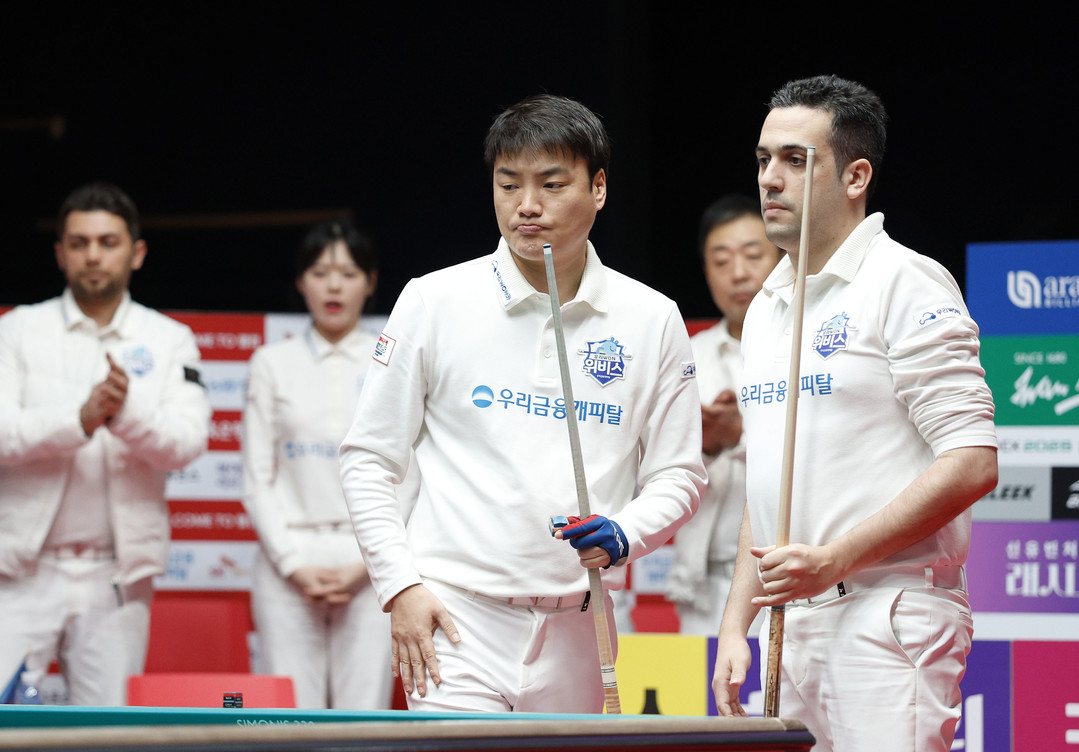 이어진 4차전. 우승까지 1승을 남겨둔 SK렌터카로선 큰 변화를 줄 필요가 없었다. 우리금융캐피탈도 같은 라인업으로 마지막 반격에 나섰다. 물러설 곳 없는 우리금융캐피탈의 열망이 강했다. 선봉에 나선 사파타와 강민구가 4이닝만에 11점을 합작하면서 11:4로 승리, 쾌조의 스타트를 끊었다. 이어 2세트서는 스롱-서한솔이 강지은-히다를 9:6(7이닝), 3세트서는 강민구가 강동궁을 15:7(4이닝)로 제압하면서 빠르게 세트스코어 3:0으로 앞서갔다.