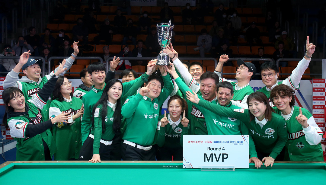 [스마트시니어뉴스=신성식 기자] PBA 팀리그 ‘디펜딩 챔피언’ 하나카드 하나페이가 최종일서 우리금융캐피탈을 끌어내리고 PBA 팀리그 4라운드 정상에 올랐다. 27일 경기도 광명시 광명시민체육관에서 열린 ‘웰컴저축은행 PBA 팀리그 광명시 투어 2024-2025’ 4라운드 최종일서 하나카드가 에스와이를 상대로 세트스코어 4:2로 승리했다. 6승2패(승점 17)로 라운드를 끝낸 하나카드는 우승 경쟁팀 우리금융캐피탈이 3:4로 SK렌터카에 패배하면서 극적으로 역전 우승했다.