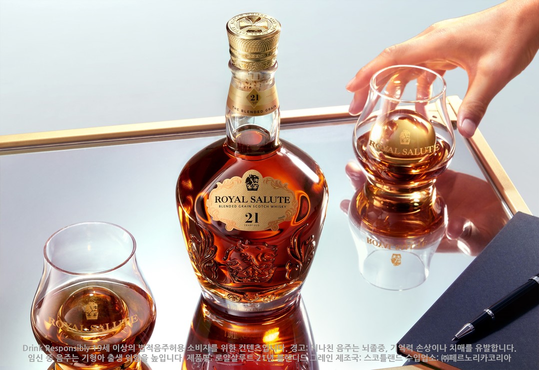 로얄살루트가 타깃 확장을 성공적으로 할 수 있었던 데에는 영국 왕실의 헤리티지를 기반으로 한 프레스티지 감성과 최고의 기술력으로 선보인 퀄리티 높은 위스키, 그리고 트렌드를 읽는 혜안에 있다. 로얄살루트는 최근 스카치 위스키의 새로운 혁신을 보여줄 ‘로얄살루트 21년 블렌디드 그레인’을 내놨다. 이 제품은 그간 쉽게 접할 수 없었던 고연산 그레인 위스키로, 로얄살루트 하우스만의 집약된 기술력과 세계적으로 인정받는 마스터 블렌더 샌디 히슬롭의 장신정신이 더해져 완성됐다. 여기에 브랜드 최초로 선보인 투명한 유리 플라곤은 모던하면서도 스타일리시한 로얄살루트의 새로운 매력을 만날 수 있다는 점에서 특히 트렌드에 민감한 소비자들의 마음을 사로잡았다.