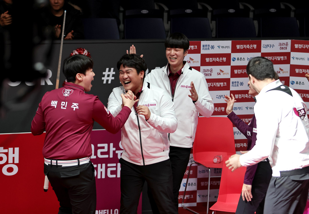 우승까지 한 세트만 남긴 5세트서 ‘백장군’ 백민주가 나섰다. 백민주는 초구를 뱅크샷으로 시작, 이어진 배치 역시 되돌리기 뱅크샷으로 단숨에 4득점을 뽑아내며 4:0으로 앞서갔다. 3이닝서도 투뱅크 넣어치기를 성공시키며 뱅크샷으로만 6득점을 뽑아냈다. 6이닝째 1득점으로 7:3, 10이닝째 남은 2득점을 채워 9:4로 승리, 경기를 4:2로 매듭지었다. NH농협카드와 승점16으로 동률을 이룬 크라운해태가 승자승 원칙에 따라 4라운드 최종 우승 팀이 됐다.
