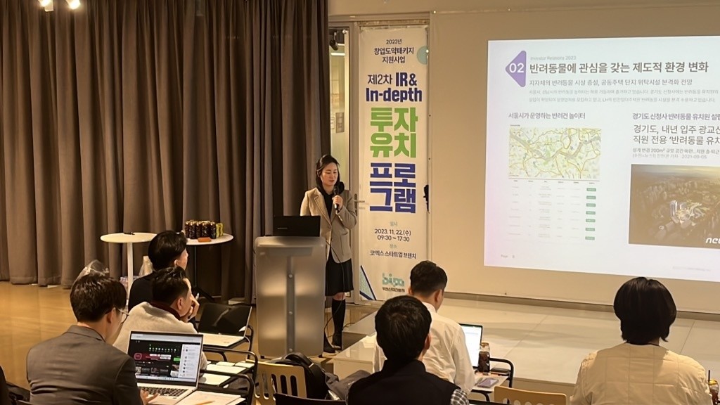 이날 제2차 IR&in-depth 투자유치프로그램에는 반려동물에 관심이 있는 많은 투자자들이 ㈜반려동물의 강아지 유치원 ‘털로덮인친구들’의 프랜차이즈 모델사업에 관심을 보였다. 그 이유 중 하나로 2010년 이후 동물보호법이 강화되고, 개 식용금지가 법제화 되면서 인구주택총조사에 반려동물이 포함될 정도로 위상이 높아졌고 반려동물에 대한 제도적 환경이 변한 것이 주 요인인 것으로 판단하고 있다.