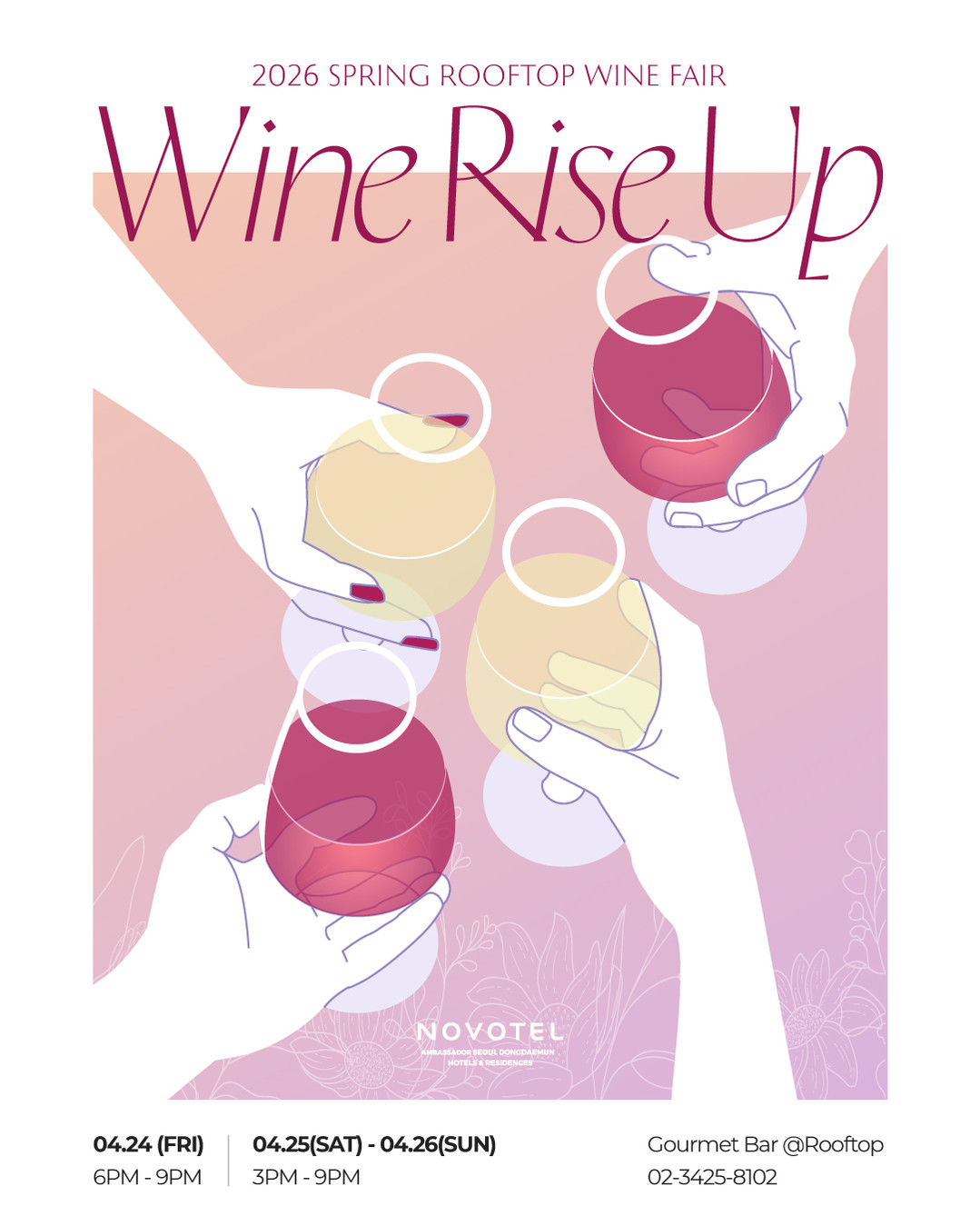 [욜드(YOLD)=김진수 기자] 노보텔 앰배서더 서울 동대문 호텔 & 레지던스(이하 ‘노보텔 앰배서더 서울 동대문’)이 오는 4월 24일부터 26일까지 3일간 최상층 루프톱에서 ‘와인 라이즈 업(Wine Riseup)’을 개최한다. 이번 와인 페어에서는 100여 종에 달하는 다양한 와인이 한곳에 모여 PNS, 동원, 차르, 한결 등 11개의 국내 주요 와인 수입사들의 폭넓은 컬렉션을 만나볼 수 있다. 현장에서는 시음 프로그램이 마련되어 각 와인의 고유한 맛과 향을 세심하게 체험할 수 있도록 구성됐다. 여기에 와인과 잘 어울리는 다양한 스낵 메뉴 등이 준비되어 와인을 더욱 다채롭게 즐길 수 있다.