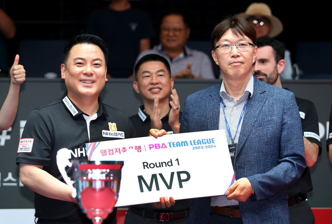 지난 3일부터 경기도 고양시 ‘고양 킨텍스 PBA 스타디움’에서 9일동안 열린 ‘웰컴저축은행 PBA 팀리그 2023-2024’ 1라운드 최종일 경기서 NH농협카드는 하나카드를 세트스코어 4:1로 꺾고 1라운드 우승컵을 들어올렸다. 2위 크라운해태가 NH농협카드를 바짝 쫓았지만 NH농협카드는 경우의 수를 따질 필요 없이 승점3을 추가하면서 자력으로 우승을 확정, 5개 팀이 경쟁하는 포스트시즌에 가장 먼저 이름을 올리게 됐다. 1라운드를 마친 PBA 팀리그는 오는 16일부터 같은 장소에서 2라운드에 돌입한다.