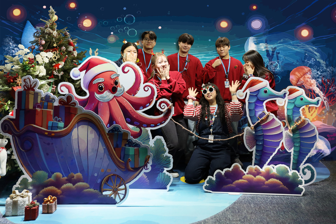 먼저 동선 곳곳에 특별한 바다 친구들과 함께 즐기는 크리스마스 포토존을 마련해 추억을 남길 수 있는 공간을 마련했다. 특히 무지개라운지 테마존에 꾸며진 포토존에서는 조개 썰매를 끄는 루돌프 해마와 선물을 나눠주는 산타 문어 포토존이 준비되어 있어 재미있게 사진을 찍을 수 있다.