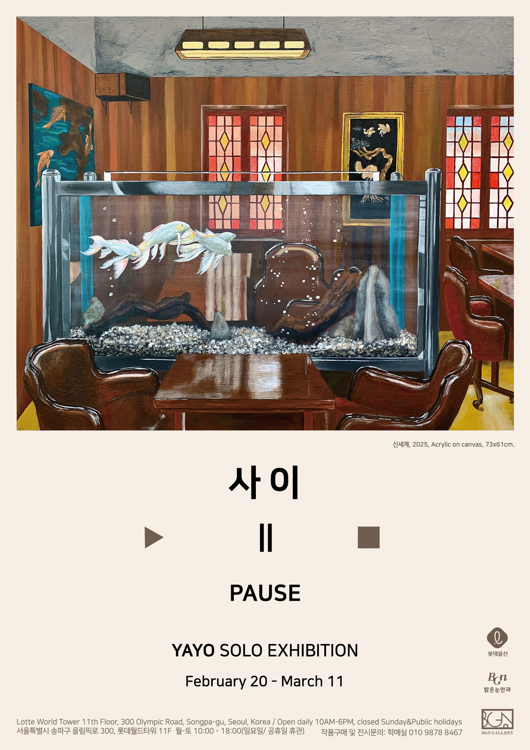 서울 송파구 올림픽대로 300 롯데월드타워 11층에 위치한 BGN갤러리에서 유소영 (야요:YAYO) 작가의 개인전 ‘사이: PAUSE’ 가 개최된다. 기간은 2025년 2월 20일 목요일부터 3월 11일 목요일까지 진행된다. 작가 아요는 여행이나 일상에서 마주치는 평범하지만 특별한 순간을 그림으로 공유한다. 재치 넘치고 위트 있는 순간들, 기억에 남는 배경 등 다양한 순간 순간을 담아내는 야요 작가는 과감한 붓 터치와 강렬한 색감들을 사용하여 인상 깊은 작업을 한다. 주로 아크릴 페인팅 작업을 하며 거침 없는 묘사가 답답하지 않고 평온한 느낌을 준다.