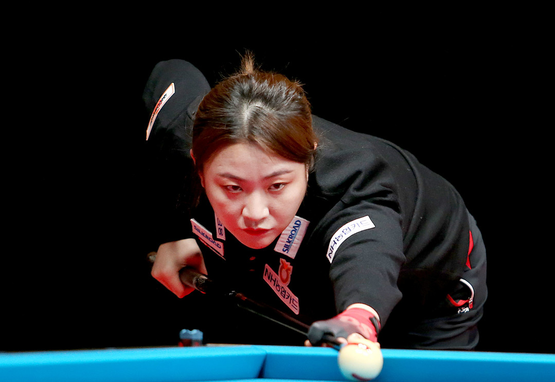 옆 테이블에서 열린 다른 8강전에서는 ‘LPBA 챔프’ 김민아(NH농협카드)가 노련한 경기운영을 앞세워 ‘무서운 신예’ 장가연(휴온스)의 돌풍을 잠재웠다. 김민아는 첫 세트를 16이닝 장기전 끝에 11:7로 승리를 거둔 이후 2세트와 3세트를 각각 11:10(15이닝), 11:6(7이닝)으로 승리하고 4강에 합류했다.