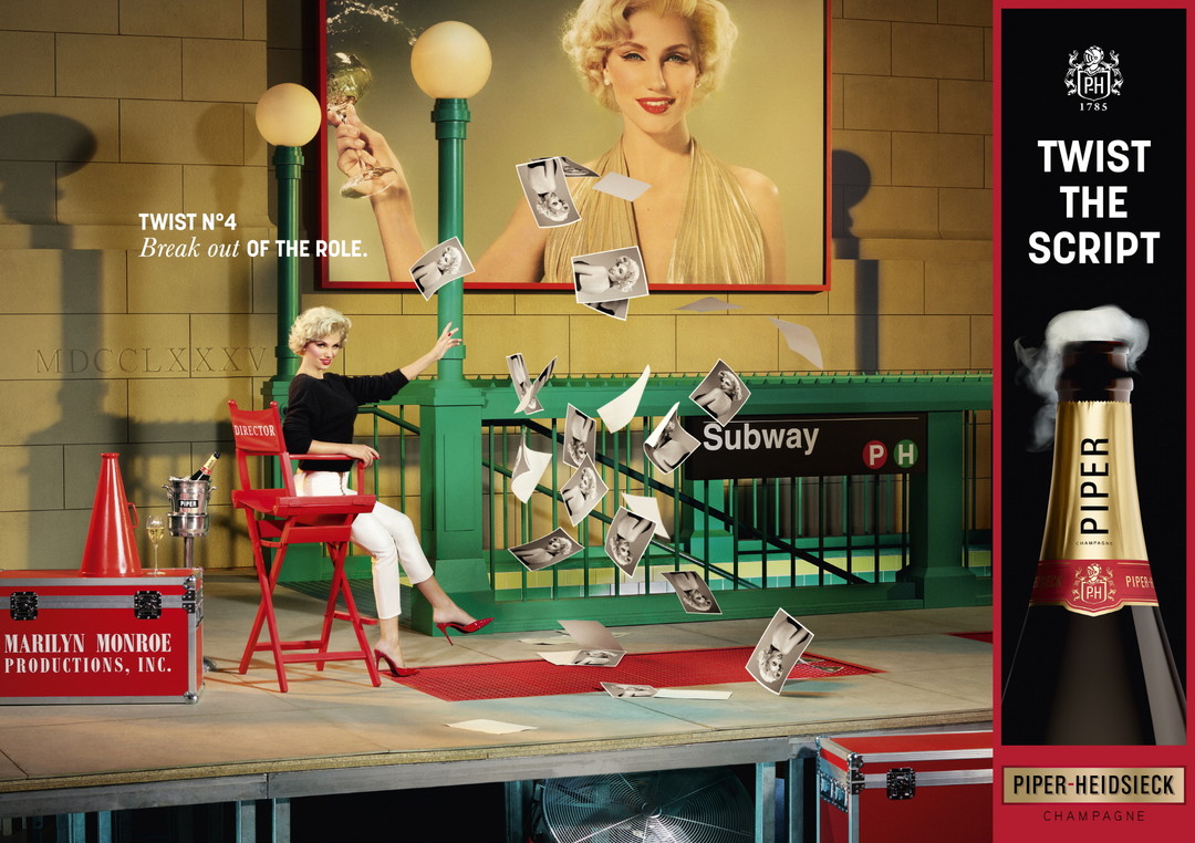 특히 한국에서의 파이퍼 하이직은 ‘마릴린 먼로가 아침에 마시는 샴페인’으로 유명하다. 하지만 이번 캠페인에서는 마릴린 먼로가 여배우 최초로 자신의 영화 제작사를 설립한 스토리를 담고 있다. 1955년 당시 그녀는 거대 메이저 스튜디오인 폭스사에 맞서 자신의 영화 제작사를 설립했다. 폭스사는 그녀와의 독점계약을 주장하기 시작했고, 약 1년간의 법정 공방 끝에 마릴린 먼로는 자신의 제작사를 설립할 수 있었다. 이번 파이퍼 하이직의 캠페인 트위스트 더 스크립트(Twist the script)에서는 이러한 그녀의 대담함과 의지를 기리기 위해 마릴린 먼로가 회사를 설립 한 후, 자신의 사진을 뿌리며 홍보하는 한 순간을 담아냈다.